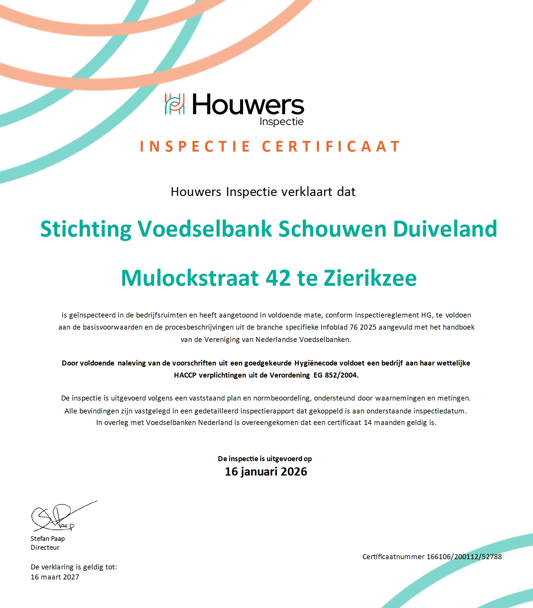 Voor de Voedselbank is voedselveiligheid zeer belangrijk. Daarom letten we er goed op dat producten die gekoeld of ingevroren moeten worden, op de juiste temperatuur bewaard worden. Zowel tijdens transport als bij de opslag. Verse producten delen we zo snel mogelijk uit aan de cliënten en bij houdbare producten letten we op de uiterste gebruiksdatum.